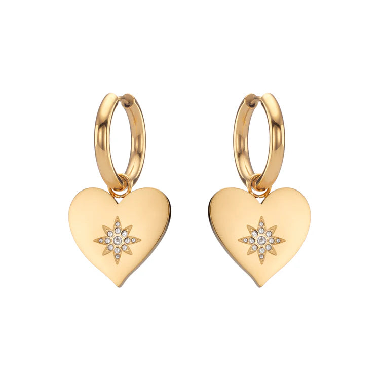 The Lucinda Heart Earrings are the perfect balance of romance and bold style. These statement hoops feature polished heart-shaped charms, each adorned with a starburst of shimmering stones that catch the light beautifully with every movement.